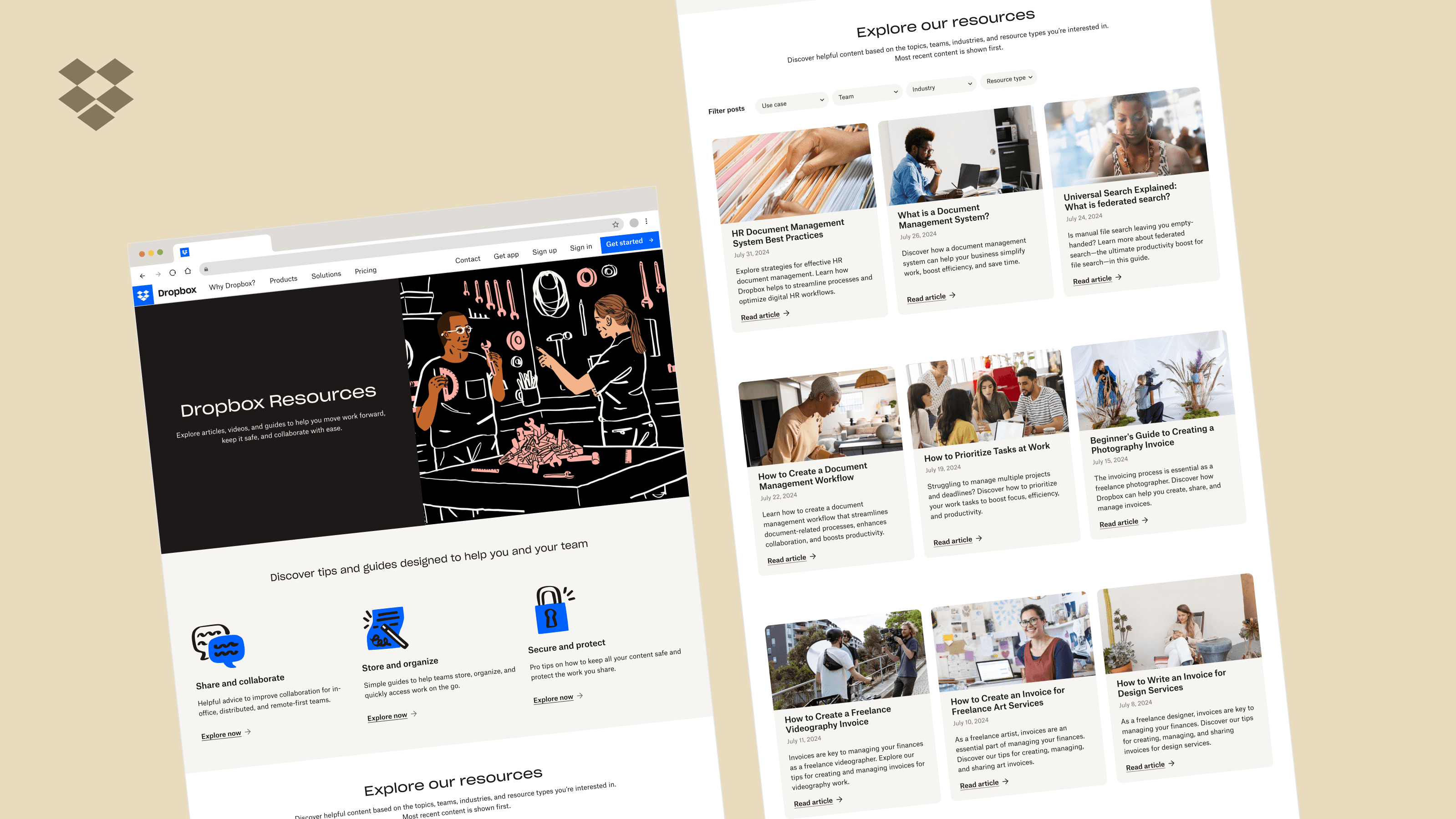 Seamlessly integrate into existing IA on Dropbox.com, plus logical flows on Resources Hub