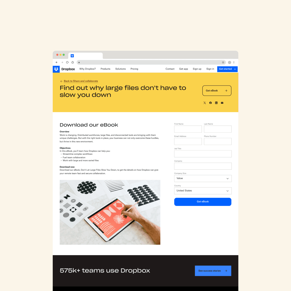 Previously, Dropbox was hosting 100+ resources (ebooks, product demos, articles) on an outdated microsite. However, it was difficult to drive traffic here and therefore difficult for users to discover. Additionally, design was outdated and underperforming. Thus we identified an opportunity to drive organic leads, and increase customer acquisition.