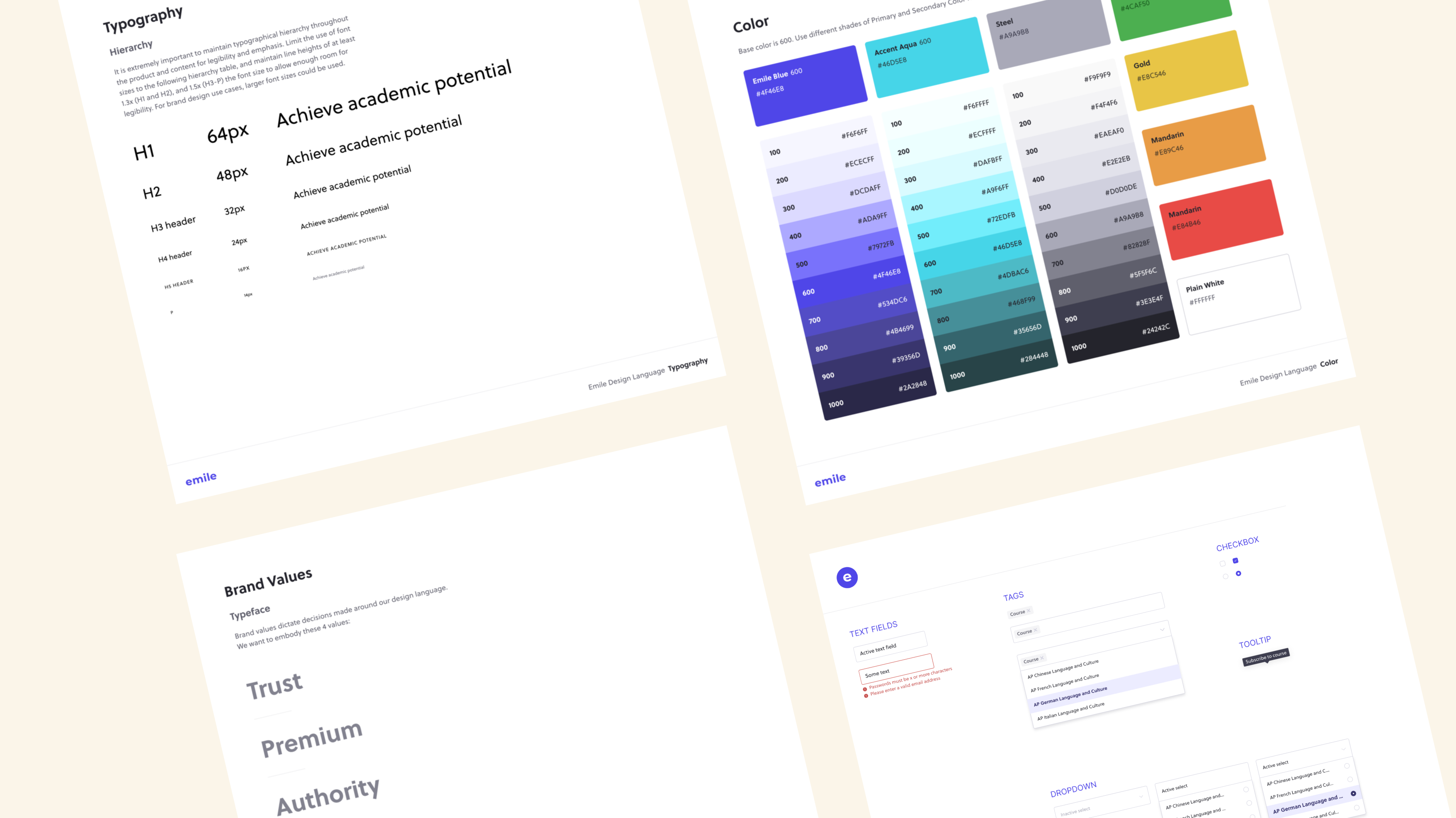 These basic components of design language (brand values, color, and typography) inform the design for Emile’s UI components. This includes everything from field inputs, to modals, to buttons and card design.